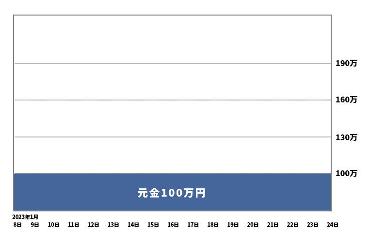 1月8日から元金100万円でスタートして1月24日までで100万円が184万になっています。利益84万円です。FXは土日がお休みなので実質11日で84万円の利益です。